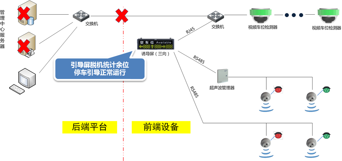管理服務(wù)器故障或網(wǎng)絡(luò)異常時(shí),引導(dǎo)屏脫機(jī)統(tǒng)計(jì)余位,停車(chē)引導(dǎo)系統(tǒng)仍可正常運(yùn)行。